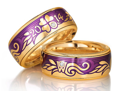 祝君好運(yùn)的限量指環(huán)「幸運(yùn)的祝!拐18k金精心鋪就四葉草圖案,并在第四片心葉上嵌入了Wellendorff(華洛芙)標(biāo)志性的璀璨鉆石。指環(huán)底紋為紫色琺瑯,紫色是幸運(yùn)與富足高貴的象征。四葉草兩邊刻有數(shù)字“2014”,意味這枚指環(huán)將成為甜蜜的見證者:見證那些充滿魔力的幸運(yùn)時(shí)刻,正是它們,讓2014年成為無(wú)可忘卻的美好年頭。「幸運(yùn)的祝!瓜蘖恐腑h(huán)衷心祝愿佩戴者能擁有如潺潺溪水般的幸運(yùn),讓幸運(yùn)緩而不息地流入她的生活。為了讓佩戴者體會(huì)到這種幸運(yùn)潤(rùn)澤人生的幸福感,指環(huán)仍采用經(jīng)久相傳的華洛芙旋轉(zhuǎn)工藝,僅為百分之一毫米的指環(huán)間距令指環(huán)可以如絲般順滑地獨(dú)立旋動(dòng)卻又渾然一體,指環(huán)與肌膚間的溫柔廝磨,讓幸運(yùn)的滋味貼身相隨。