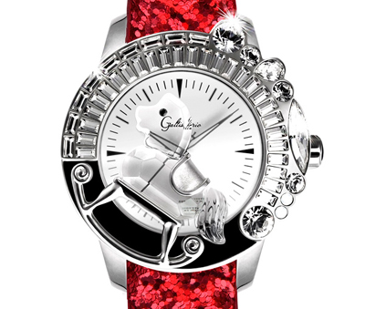 迦堤品牌的標(biāo)志,在神奇木馬的設(shè)計(jì)意念中,加上極為炫目的Bling Bling閃爍的皮帶,令人目不暇給;再加上表殼著Galtiscopio招牌「GP