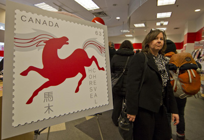 1月13日,在加拿大多倫多一家郵局,一位女士從一幅加拿大國(guó)內(nèi)版馬年生肖郵票海報(bào)旁經(jīng)過(guò)。 當(dāng)日,為迎接中國(guó)農(nóng)歷甲午馬年,加拿大郵政總局開(kāi)始發(fā)行馬年生肖郵票,包括首日封、紀(jì)念封、國(guó)內(nèi)及國(guó)際版郵資郵票等。加拿大郵政總局于1997年開(kāi)始發(fā)行中國(guó)生肖郵票。