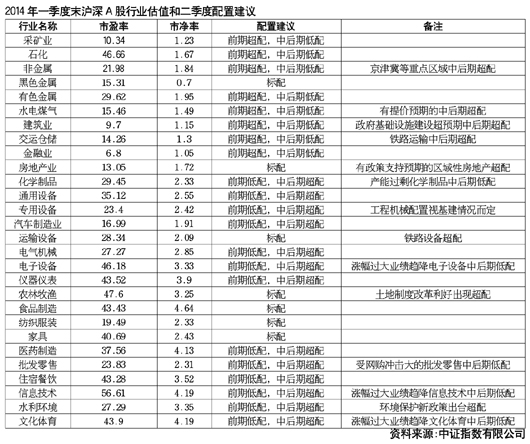 2014年二季度前期,建議適當超配金融、有政策支持預期的區(qū)域性房地產(chǎn)和上游行業(yè),低配中游制造行業(yè)和下游消費行業(yè);二季度中后期,建議低配金融房地產(chǎn)和上游行業(yè),超配中游制造行業(yè)和下游消費行業(yè)。對個別行業(yè)也有例外建議。