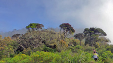 進園后按路標有9.4公里的徒步環(huán)形道。一路上隨處可見熱帶植物和蕨類植物,有深褐色的,有銀色的。路則越來越難走,有時在草叢中走,有時在狹窄的小道上走,有時要攀登超過三十公分的高臺階,以至于大家不得不互相攙扶。