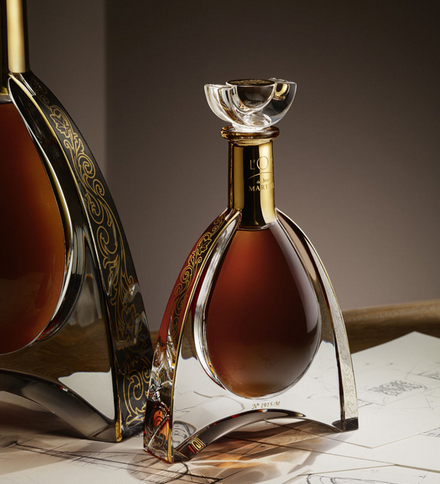 Sèvres設(shè)計(jì)制作了采用金蝕刻工藝的人工吹制水晶玻璃酒瓶,包裝在由法國(guó)室內(nèi)建筑師及設(shè)計(jì)師Eric