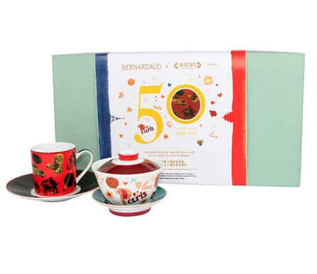 2014年,是中華人民共和國與法國建交五十周年,以「巧手」為年度主題的福茗堂茶莊與法國頂級瓷器品牌里摩日(Limoges)的栢圖(Bernardaud),攜手合作設(shè)計了一對限量1,964件,融合兩國國飲文化的中國蓋碗茶盅與法國咖啡杯。作為對法國遺產(chǎn)做出卓越貢獻(xiàn),同時也是法國精品行業(yè)聯(lián)合會ComiteColbert七十個尊貴成員之列的法國頂級瓷器品牌栢圖,