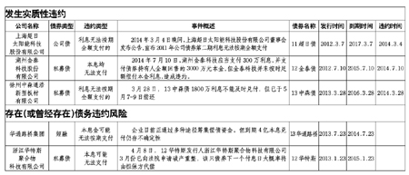2014年3月4日晚間,上海超日太陽(yáng)能科技股份有限公司董事會(huì)發(fā)布公告,宣布2011年公司債券第二期利息無(wú)法按期全額支付,從而構(gòu)成國(guó)內(nèi)首例債券違約事件,并拉開(kāi)了2014年債務(wù)違約的序曲。截至7月,市場(chǎng)上發(fā)生實(shí)質(zhì)性違約及有違約風(fēng)險(xiǎn)提示的債券下表。