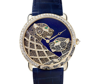 Filigrane金銀絲細(xì)工美洲豹裝飾腕表,通過其形象生動(dòng)而精致細(xì)膩的設(shè)計(jì),重新詮釋了古老的金銀絲細(xì)工技藝。這一具有鮮明革新性的創(chuàng)作探索,見證卡地亞重拾并傳承失傳工藝與技術(shù)的神圣使命,正如2013年的金屬珠粒工藝。