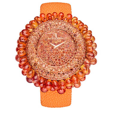 的非凡破格創(chuàng)意與頂尖工藝早已備受推崇,作品每每有打破常規(guī)、令人嘆為觀止的奇思妙想,純熟結(jié)合品牌高級(jí)珠寶制作與制表工藝專才,輔以華貴絕色寶石、一流切割技術(shù)與頂尖鑲嵌造詣,令珠寶時(shí)計(jì)平添與眾不同的個(gè)性風(fēng)韻。Grappoli系列薈萃五款獨(dú)一無二新作,除了綠寶石與白鉆之外,還有彩鮮目眩的橙藍(lán)寶、濃艷華貴藍(lán)寶還有溫潤紫晶,如繽紛彩虹眾色競(jìng)爭妍。