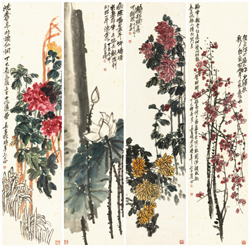 吳昌碩 花香四時(shí) 紙本立軸 1917年作 出 版: 《日本藏吳昌碩金石書(shū)畫(huà)精選》P134-135,西泠印社出版社,2004年。 備注:王震題盒。 133×33 cm×4 約4.0平尺(每幅) |