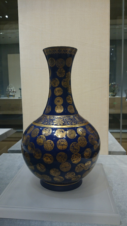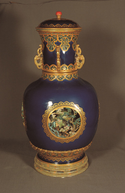 南京博物院鎮(zhèn)院之寶:清乾隆 藍(lán)釉描金粉彩開光轉(zhuǎn)心瓶 |