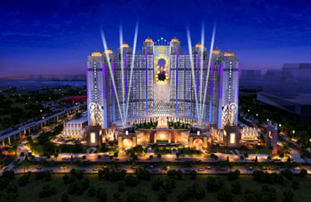 而度假村外觀最引人眼球的恐怕就是位于兩棟酒店中間頂樓的摩天輪!8字形”的摩天輪外觀有如圓滾滾的葫蘆,分外可愛。這個(gè)摩天輪更有一個(gè)閃亮的名字——“影匯之星”,它飽含著何猷龍打造澳門新地標(biāo)的希望。摩天輪靈感源自“蝙蝠俠”系列影片中“葛咸城”大樓上的探照燈,8則是中國的吉祥數(shù)字,寓意“財(cái)源廣進(jìn)”。這座摩天輪有130米高,建成后會(huì)是亞洲最高的摩天輪。