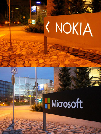 諾基亞2014年4月25日宣布完成向微軟出售手機業(yè)務部門。拍攝于2013年9月8日,位于芬蘭埃斯波的諾基亞總部;下圖拍攝于2014年4月26日,位于芬蘭埃斯波市的原諾基亞總部已更換微軟標志。記者 李驥志/攝 |