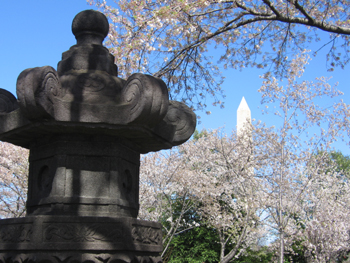 湖畔林中,水光瀲滟、樹影婆娑。在1912年由兩位夫人手植的兩株櫻樹附近,有一石燈及一石塔,均系花崗巖材質(zhì)。燈矮塔高,皆是來自日本的古物。九重檐佛塔兩米多高,塔上蓮花和櫻花圖案依稀可辨,但祭奠文字早已模糊不清。具體年代不詳,屬于鐮倉時(shí)代的典型禪宗藝術(shù)風(fēng)格。佛教西來東土,在中國被改良成本土禪宗。南宋時(shí),禪宗傳入日本。石燈高一米多,原立于東京寬永寺內(nèi)。它造于1651年(順治八年),是為祭奠去世的日本德川幕府第三代將軍家光,其祖父即赫赫有名的德川家康。一對石燈,一在華盛頓,一在上野公園內(nèi)的寛永寺遺址。1945年的東京大轟炸導(dǎo)致大火,寺毀燈存。