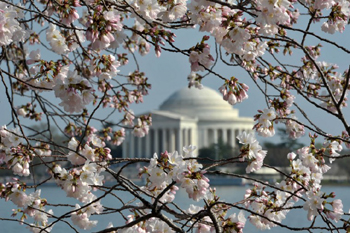 1935年,華盛頓舉辦第一屆“櫻花節(jié)”。四年后,羅斯?偨y(tǒng)在遍植櫻樹的潮汐湖南岸,為美國開國元?jiǎng)诇R斯·杰弗遜紀(jì)念堂奠基。這座與華盛頓紀(jì)念碑、白宮、國會(huì)大廈和林肯紀(jì)念堂齊名的建筑,當(dāng)時(shí)也是爭議不斷,其一就是櫻樹。因建筑占地近八萬平方米,需砍掉一些老榆樹和櫻花樹。許多美國婦女將自己綁在櫻樹上,發(fā)誓與樹共存亡。她們當(dāng)算是拆遷釘子戶的老祖母。最后雙方各讓一步,政府承諾在紀(jì)念堂完工后廣植櫻樹。