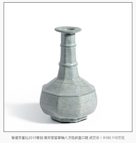 2015年已經(jīng)過半,藝術市場上各大拍行春拍也相繼收槌。瓷器板塊,香港蘇富比春拍一件南宋官窯青釉八方弦紋盤口瓶以1億1388萬港元(約合9190萬人民幣)的成交價占據(jù)2015上半年的排行榜頭名,這一價格也成為宋代瓷器歷史第三高拍賣成交價。高古瓷器的市場走高也被相當一部分業(yè)內(nèi)人士認為是古瓷市場回歸理性的征兆。
