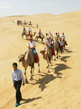 游客在內(nèi)蒙古響沙灣旅游景區(qū)體驗(yàn)騎駱駝。