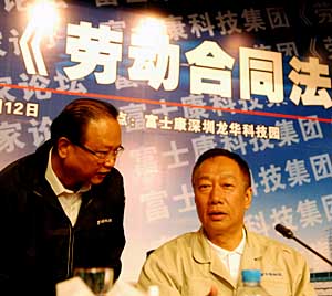 | 富士康科技集團(tuán)12日在深圳舉行《勞動(dòng)合同法》專(zhuān)題論壇,邀請(qǐng)勞動(dòng)部、國(guó)臺(tái)辦、全國(guó)總工會(huì)等相關(guān)部門(mén)的專(zhuān)家解答了企業(yè)和員工的疑問(wèn)。富士康表示,將積極實(shí)施《勞動(dòng)合同法》,與數(shù)萬(wàn)已連續(xù)工作8年以上的員工簽訂無(wú)固定期限勞動(dòng)合同。富士康科技集團(tuán)總裁郭臺(tái)銘(右者)在研討會(huì)上表示,富士康將積極實(shí)施《勞動(dòng)合同法》,全力推動(dòng)有富士康特色的勞動(dòng)合同制度,創(chuàng)造勞資雙贏、留住人才的局面,同時(shí)積極履行《勞動(dòng)合同法》規(guī)定的法律責(zé)任,做到合法經(jīng)營(yíng)。新華社記者