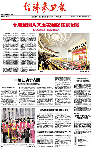 | 2007年:審議通過《物權(quán)法》 | | --------------------------------------- | | 2007年3月17日《經(jīng)濟(jì)參考報》頭版頭條刊登了十屆全國人大五次會議閉幕的消息,突出報道了大會通過《物權(quán)法》和《企業(yè)所得稅法》。而事實(shí)上,本報在16日就已對兩部法律的修改情況做了大篇幅的報道。歷時13年的制定過程,經(jīng)過全國人大及其常委會的多次審議,從起草到修改再到正式頒布實(shí)施,《物權(quán)法》一直受到全社會的普遍關(guān)注。因?yàn)椤段餀?quán)法》的制定,既涉及國家的基本經(jīng)濟(jì)制度,又關(guān)系廣大人民的切身利益。 |