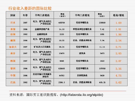 與國際相比,日本最高比值是1.69倍,英國是1.91倍,法國1.96倍,德國2.23倍,加拿大2.71倍,巴西比較高是5.62倍。我們總是擔心中國陷入拉美式的經(jīng)濟陷阱,然而,根據(jù)國家統(tǒng)計局發(fā)布的今年第一季度最新行業(yè)平均工資數(shù)據(jù),可以計算出我國收入最高的行業(yè)是證券業(yè),是全國平均水平的5.9倍,金融業(yè)是平均工資的3倍。而較低的木材加工業(yè)只有全國平均水平的53.6%,紡織業(yè)是全國平均水平的55.5%,農(nóng)副產(chǎn)品是60.1%,最高與最低行業(yè)平均工資之比是11比1,遠遠超過巴西。