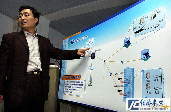 在建設(shè)部授予“全國(guó)數(shù)字社區(qū)示范工程”稱號(hào)的江蘇鎮(zhèn)江恒美嘉園光纖到戶項(xiàng)目現(xiàn)場(chǎng),工作人員在介紹光纖到戶、三網(wǎng)融合示意圖。2005年,該光纖駐地網(wǎng)就全面開(kāi)通,覆蓋用戶1000多家。資料照片 |
