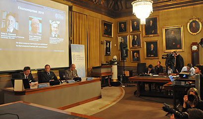 | 2010年10月11日,瑞典皇家科學(xué)院宣布,美國(guó)經(jīng)濟(jì)學(xué)家彼得·戴蒙德和戴爾·莫頓森,以及具有英國(guó)和塞浦路斯雙重國(guó)籍的經(jīng)濟(jì)學(xué)家克里斯托弗·皮薩里德斯將分享2010年諾貝爾經(jīng)濟(jì)學(xué)獎(jiǎng)。瑞典皇家科學(xué)院當(dāng)天說(shuō),這三名經(jīng)濟(jì)學(xué)家憑借對(duì)“經(jīng)濟(jì)政策如何影響失業(yè)率”理論的進(jìn)一步分析,摘得2010年諾貝爾經(jīng)濟(jì)學(xué)獎(jiǎng)桂冠。三人的理論可以解釋許多經(jīng)濟(jì)現(xiàn)象,包括“為何存在很多職位空缺的時(shí)候,仍有眾多人失業(yè)”。三人建立的經(jīng)濟(jì)模型還有助于人們理解“規(guī)章制度和經(jīng)濟(jì)政策如何影響失業(yè)率、職位空缺和工資”。新華社記者