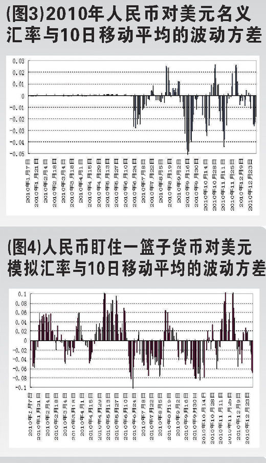 這是重啟匯改增強(qiáng)人民幣匯率彈性的結(jié)果。圖3和圖4分別顯示了2010年人民幣對(duì)美元匯率模擬值與實(shí)際值與其10日移動(dòng)平均線(xiàn)的波動(dòng)方差。從中可見(jiàn),匯改之前人民幣兌美元匯率基本沒(méi)有波動(dòng),匯改以后,波動(dòng)幅度明顯加大,但與盯住一籃子貨幣模擬匯率比較,其波動(dòng)幅度仍然偏小,其平均方差僅0.00385,而后者為0.0242。而且人民幣兌美元匯率波動(dòng)存在較明顯的偏向,向下波動(dòng)較大,而向上波動(dòng)太小。因此,進(jìn)一步增強(qiáng)人民幣對(duì)美元匯率彈性,特別是雙向波動(dòng)幅度,不僅有利于增加熱錢(qián)炒作人民幣匯率的風(fēng)險(xiǎn),而且有利于減少人民幣有效匯率的波動(dòng),降低其對(duì)進(jìn)出口貿(mào)易的不利影響。