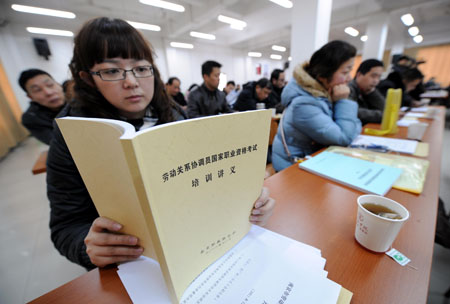 建立文明的勞動(dòng)法制度,建設(shè)和諧的勞動(dòng)關(guān)系,是建立和諧社會(huì)的組成部分。 圖為不久前南京市舉辦的首期勞動(dòng)關(guān)系協(xié)調(diào)員國家職業(yè)資格培訓(xùn)班。勞動(dòng)關(guān)系協(xié)調(diào)員是國家公布的十批106個(gè)新職業(yè)中最新的一個(gè)職業(yè)工種,其主要工作內(nèi)容包括實(shí)施勞動(dòng)標(biāo)準(zhǔn)、管理勞動(dòng)合同、開展集體協(xié)商、制定和實(shí)施內(nèi)部規(guī)章制度、開展勞資溝通和民主管理以及協(xié)調(diào)處理員工申訴和勞動(dòng)爭議。記者