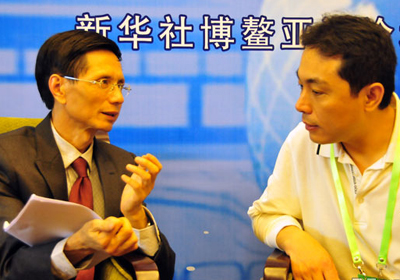 經(jīng)濟學(xué)家、成都大學(xué)副校長張其佐(左)接受新華社博鰲高端訪談 新華網(wǎng) 黃丹 攝