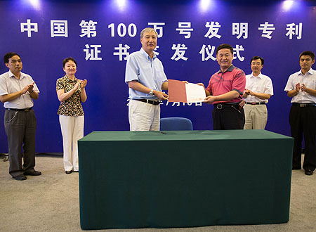 7月16日,國(guó)家知識(shí)產(chǎn)權(quán)局局長(zhǎng)田力普(左三)向發(fā)明專利權(quán)利人北京農(nóng)業(yè)信息技術(shù)研究中心的負(fù)責(zé)人頒發(fā)證書。此次簽發(fā)的第100萬號(hào)授權(quán)發(fā)明專利名稱為“一種虛擬玉米葉片模型可控面元?jiǎng)澐址椒ā。?985年授權(quán)首件發(fā)明專利以來,至今年7月11日,我國(guó)27年時(shí)間里發(fā)明專利累計(jì)授權(quán)量達(dá)到100萬件,成為世界上達(dá)到這個(gè)目標(biāo)耗時(shí)最短的國(guó)家。但是,我們的專利擁有總量、國(guó)民人均擁有量、專利轉(zhuǎn)化率,還遠(yuǎn)遠(yuǎn)落后于許多領(lǐng)先的創(chuàng)新性國(guó)家。記者 金立旺 攝 |