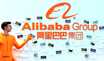 3月17日,德國漢諾威通信和信息技術博覽會中國展區(qū)阿里巴巴展臺展示參觀者留言寄語墻板。 記者