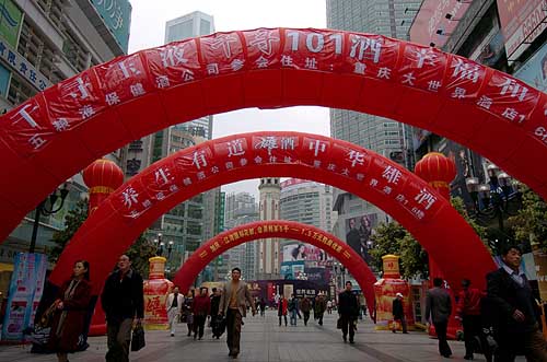 3月19日,重慶最大商業(yè)區(qū)解放碑的廣告彩虹。2007年春季全國糖酒會將于23至25日在重慶舉行,鋪天蓋地的廣告近日已將重慶不少重點路段包圍。據(jù)不完全統(tǒng)計,本屆糖酒會發(fā)布噴繪布幅、廣告牌、看牌、大型過街門樓、特裝造型等各種廣告面積將達5萬平方米左右。