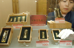 11月16日,北京菜市口百貨股份有限公司的工作人員在擺放“豬年賀歲”金條。由中國金幣總公司發(fā)行的“豬年賀歲”金條將于11月17日由北京菜市口百貨股份有限公司在全國首發(fā)。今年的賀歲金條規(guī)格為1000克、500克、200克、100克和50克5種,全國總發(fā)行量3000公斤。