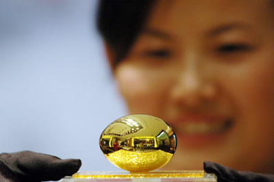 11月13日,在濟(jì)南一家珠寶店,工作人員展示用千足金制成的“金蛋”。 這款“金蛋”重16.18克。雖然距元旦還有一段時(shí)間,但商家已開始搶占新年商機(jī)。