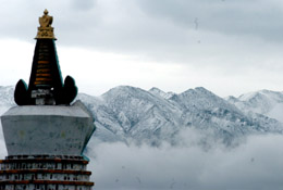 青海湖畔的佛塔與“雪山云海”奇觀相映成趣。 本報記者:侯德強(qiáng) 攝 |
