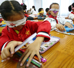 為迎接10月15日“世界盲人日”,重慶市永川區(qū)上游小學(xué)四年級學(xué)生開展“體驗(yàn)盲人生活”團(tuán)隊(duì)活動,包括盲聽、盲走等。學(xué)生們在活動中體會到盲人生活的艱辛,并認(rèn)識愛護(hù)眼睛的重要性。新華社發(fā)(陳仕川
