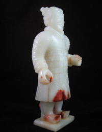 2008年10月,兩件海外回流文物將由北京中嘉國際拍賣公司公開拍賣,一件是戰(zhàn)國和田玉武士俑,另一件是戰(zhàn)國和田玉劍。 在傳世古玉器中,用新疆和田籽玉琢制而成的藝術品尤其珍貴。將要拍賣的戰(zhàn)國秦武士俑高23厘米,選用上等和田籽玉,玉質如羊脂般潔白細膩。俑身下部帶有朱砂紅泌、衣甲邊延有非常珍貴的只有和田籽玉才有的棗皮紅。人物莊重、肅穆的表情,體現(xiàn)了武士的威嚴和恭敬,且形象生動,服飾衣甲、發(fā)式均真實具體,人物臉部輪廓及紋飾線條極為流暢自然,傳神、生動,極具藝術魅力,體現(xiàn)了戰(zhàn)國時代琢玉藝人高超的工藝和非凡的藝術想象力。 另一件戰(zhàn)國和田玉劍為新疆和田籽料琢制,長49.8厘米,由劍首、劍莖、劍格、劍身所組成,劍首為扁圓餅狀,帶有少量朱砂紅泌,裝飾紋分為內外兩部分,外部為一圈柿蒂紋圍繞,內部為隆起的一朵菱花紋,線條流暢而有動感,莖部為螺旋紋,工藝要求精度極高,劍格浮雕饕餮紋,紋飾精美,是典型戰(zhàn)國中、晚期風格,為戰(zhàn)國時楚國的形制。其工藝之精巧,劍形之美,紋飾之細膩,用料之考究。 北京市文物局副研究員、鑒定專家史潤梅認為,這兩件戰(zhàn)國玉器,用料為新疆和田籽玉,溫潤潔白,如羊脂,工藝水平非常高超,用現(xiàn)代工具都達不到,玉俑面部輪廓細膩、發(fā)絲清晰,衣紋鎧甲,飄逸整齊。玉劍形式規(guī)整,做工精致。為難得一見的精品玉器。 |
