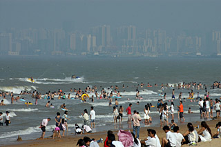 | 10月1日,大批游客在風(fēng)和日麗的海口假日海灘游泳。蒙鐘德