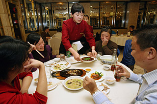 “很抱歉,第一批,也就是晚上4點半到7點半的位子已經(jīng)全部訂滿了!庇浾呓找灶櫩蜕矸葜码娚虾R患摇懊懒珠w”餐館,要求預(yù)訂年夜飯。得到的回答是,大年三十那天晚上,只有7點半以后的第二批年夜飯還有部分空位,而且數(shù)量不多。 在“小南國”“豐收日”“南新雅”等一些上海比較知名的餐館飯店,工作人員也紛紛表示,2009年的年夜飯預(yù)訂情況良好。到目前為止,飯店包廂、大廳的位置基本上預(yù)訂一空。即使有少量剩余空位,也大多是四人以下的小桌。 “我們的年夜飯已經(jīng)預(yù)訂了九成左右。”上海錦江飯店宴銷部經(jīng)理吉蓓莉介紹說,截止到2008年12月29日,這家飯店的10個包房已全部被預(yù)訂,平均每桌年夜飯的價格為4000元至5000元;大廳里,每桌價格2888元的10人包桌,也預(yù)訂了59桌,僅有四桌還未訂出。 根據(jù)上海餐飲行業(yè)協(xié)會的統(tǒng)計調(diào)查,其800多家會員餐飲企業(yè),2009年的年夜飯預(yù)訂基本沒有受到明顯沖擊,不少顧客提前幾個月就交付了訂金。而在餐飲企業(yè)推出的各檔次年夜飯中,10人至12人、價位在每桌1500元左右的年夜飯,比較受到消費(fèi)者的青睞。 類似的情形也出現(xiàn)在北京、廣東、江蘇等地。尤其是部分老字號餐飲企業(yè),年夜飯的預(yù)訂依然保持著比較紅火的行情,有的甚至“一桌難求”。這樣看來,在許多百貨商場、家電賣場不得不靠打折促銷來遏制銷售業(yè)績下滑的時候,經(jīng)營年夜飯的老字號餐飲企業(yè),似乎日子相對比較好過。