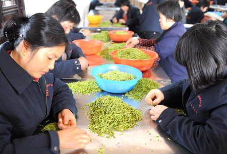 日,茶葉專業(yè)合作社的職工在分揀新摘的茶葉。 當(dāng)日,享譽(yù)海內(nèi)外的蘇州洞庭碧螺春茶在太湖洞庭東、西山開始陸續(xù)采摘。據(jù)專家介紹,隨著近期氣溫上升,一周后蘇州洞庭碧螺春茶將大批量應(yīng)市,預(yù)計今年蘇州洞庭碧螺春茶產(chǎn)量為140多噸。洞庭碧螺春種植于太湖洞庭洞西山的果園之中,茶樹常年受太湖霧氣滋潤,并包吸四季花果之香,炒制的茶葉具有“條索纖細(xì),卷曲成螺,茸毛遍體,銀綠隱翠”之外形和“湯色碧綠、入口爽甜、回味無窮”之內(nèi)質(zhì),制作500克特級洞庭(山)碧螺春茶約需一芽一葉的嫩芽6萬個左右。 |