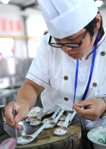 6月28日,一位參賽選手在進(jìn)行中餐熱菜項目的比賽。 當(dāng)日,2009年全國職業(yè)院校烹飪技能比賽在天津舉行。來自全國的210名參賽選手角逐中餐熱菜、中餐面點(diǎn)、中餐冷拼、果蔬雕競賽項目的上百個單項獎。