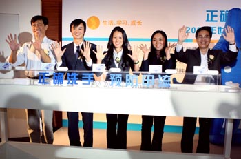 衛(wèi)生部應急辦張國新副主任、中國健康教育中心衛(wèi)生部新聞宣傳中心陶茂萱副主任、中國紅十字會賑濟部王平部長、舒膚佳品牌總監(jiān)周濤、舒膚佳健康大使楊揚5人共同演示正確洗手方法。本報記者