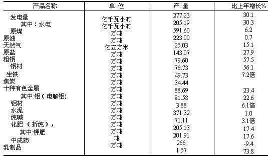 全省工業(yè)增加值265億元,按可比價格計算,比上年增長18.7%。規(guī)模以上(全部國有工業(yè)及年產品銷售收入在500萬元以上的非國有工業(yè)企業(yè))工業(yè)增加值240.34億元,增長20.4%;新產品產值8.74億元,比上年增長33.6%。 全年四大支柱產業(yè)創(chuàng)造增加值142.10億元,比上年增長17.7%。其中,石油和天然氣開采業(yè)46.81億元,增長5.5%,水力發(fā)電業(yè)21.52億元,增長23.8%,有色金屬業(yè)54.45億元,增長22.0%,鹽化工業(yè)19.32億元,增長31.6%。