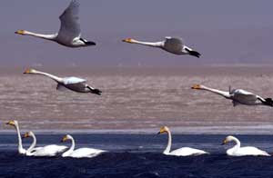 大天鵝棲息青海湖。攝影/本報(bào)記者