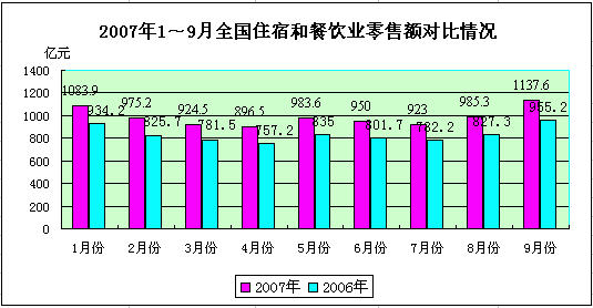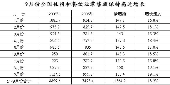 今年前三季度,我國住宿和餐飲行業(yè)實現(xiàn)較好較快發(fā)展,餐飲消費再創(chuàng)佳績。據(jù)有關(guān)數(shù)據(jù)分析,1-9月份全國住宿與餐飲業(yè)零售額累計8859.6億元,同比凈增1364.2億元,增長18.2%,增幅比去年同期高出3.3個百分點,比社會消費品零售總額增長高出2.3個百分點,占社會消費品零售總額的比重為13.9%,對社會消費品零售總額的增長貢獻率為15.6%。 從限額分類看,1-9月份,限額以上住宿與餐飲企業(yè)增速領(lǐng)先,零售額占全國住宿與餐飲業(yè)零售額的29.7%,同比增長18.9%,高于同期全國住宿與餐飲業(yè)零售額增幅0.7個百分點,拉動全國住宿與餐飲業(yè)零售額增長5.6個百分點。限額以下住宿與餐飲企業(yè)穩(wěn)中有升,零售額占全國住宿與餐飲業(yè)零售額的70.3%,同比增長17.9%,低于同期全國住宿與餐飲業(yè)零售額增幅0.3個百分點,拉動全國住宿與餐飲業(yè)零售額增長12.6個百分點。 利用外資增速趨緩。1-9月份,住宿與餐飲業(yè)新設立外商投資企業(yè)數(shù)量進一步減少,為683家,同比下降15.1%;合同外資金額24.23億美元,同比增長13.6%;實際使用外資金額6億美元,同比增長8.6%,但增幅比去年同期有所減緩。 隨著全國餐飲消費安全專項整治活動的深入開展,住宿和餐飲市場將進一步規(guī)范,食品安全進一步加強,服務質(zhì)量進一步提升,預測第四季度大眾化餐飲消費將繼續(xù)擴大,集團餐飲消費將更加集中,預計全年住宿和餐飲業(yè)零售額將達到12270億元,同比增長18.6%。