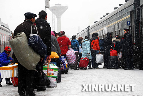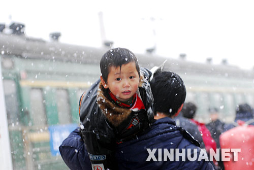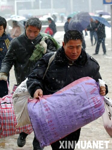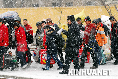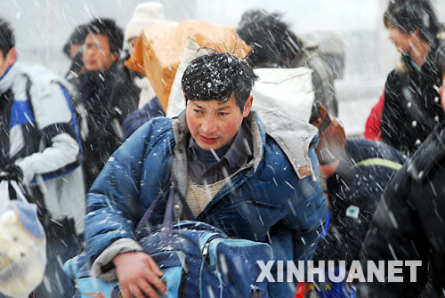| 1月23日,外來務(wù)工人員冒雪在煙臺火車站登車。新華社發(fā) 申吉忠