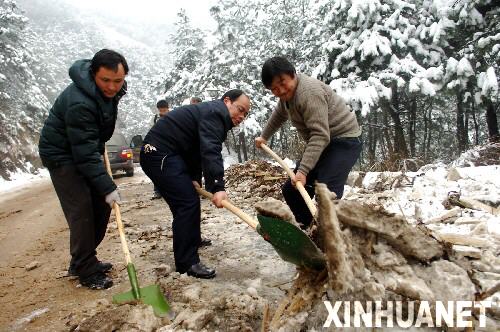 | 1月23日,安慶運輸公司岳西分公司的幾位工人自發(fā)地在山路上除雪。