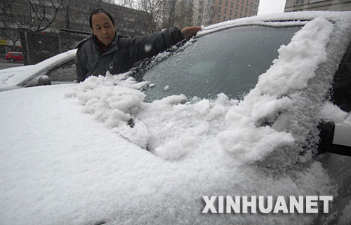1月26日,一位市民在清除車上厚厚的積雪。新華社記者 徐昱 攝
