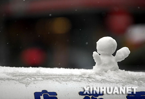 1月26日,停在杭州市區(qū)內(nèi)的一輛車的車頂積雪被堆成了小雪人。新華社記者 徐昱 攝