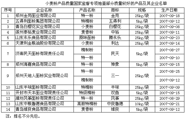 為維護消費者的合法權(quán)益,促進小麥粉行業(yè)健康發(fā)展,春節(jié)前夕,國家質(zhì)檢總局組織對部分“年貨”食品進行了國家監(jiān)督專項抽查。其中,小麥粉產(chǎn)品共抽查了北京、天津、河南、河北、山東、內(nèi)蒙古、寧夏等7個省、直轄市55家企業(yè)生產(chǎn)的60種產(chǎn)品(不涉及出口產(chǎn)品),產(chǎn)品實物質(zhì)量抽樣合格率為100%。