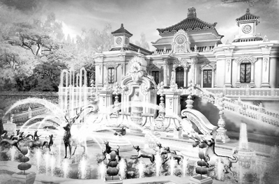 | 橫店圓明新園效果圖(西洋樓—大水法) | 公元1860年,大火在焚燒了整整3天后,享有“萬園之園”美譽的清代皇家園林——圓明園,被燒得面目全非,只剩下了殘垣斷壁。 此后的百余年間,是否要重建圓明園的爭論卻一直沒有停止過。無論是主張修復的“主修派”,還是主張維持原狀的“保留派”,都舉步維艱。無可否認的是,這片廢墟承載了太多的沉重記憶,列強侵略中國的歷史在這里鐫刻。 2006年初,以經(jīng)營影視基地而聞名的浙江橫店集團宣布將籌建圓明新園。建筑界、學術界一片嘩然,眾多網(wǎng)民也紛紛發(fā)表自己的觀點。2008年2