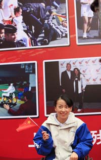 4月13日,在巴黎火炬?zhèn)鬟f活動(dòng)中全力保護(hù)奧運(yùn)火炬的中國(guó)殘疾人運(yùn)動(dòng)員金晶從北京回到家鄉(xiāng)上海。圖為金晶在歡迎儀式上留影。