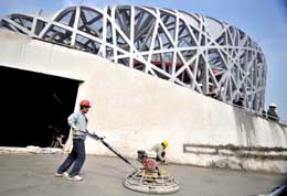 4月11日,工人在國(guó)家體育場(chǎng)(“鳥(niǎo)巢”)施工!昂眠\(yùn)北京”國(guó)際田徑競(jìng)走挑戰(zhàn)賽4月18日至19日將在國(guó)家體育場(chǎng)(“鳥(niǎo)巢”)舉行,這將是國(guó)家體育場(chǎng)第一次公開(kāi)亮相,“鳥(niǎo)巢”也將迎來(lái)首批參賽運(yùn)動(dòng)員和觀眾。